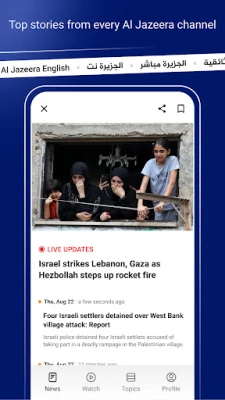 "Al Jazeera | الجزيرة News" আপনাকে ২৪/৭ লাইভ ভিডিও স্ট্রিমিং এবং অন-ডিমান্ড নিউজ ক্লিপসের মাধ্যমে এক অসাধারণ মাল্টিমিডিয়া অভিজ্ঞতা প্রদান করে। চিত্তাকর্ষক ছবি গ্যালারি এবং গভীর চিন্তাভাবনামূলক মতামত কলামগুলি প্রতিটি বিষয়কে আরও প্রাণবন্ত করে তোলে। আপনি আপনার পছন্দ অনুযায়ী লাইট বা ডার্ক মোড বেছে নিয়ে আরামদায়ক উপায়ে সংবাদ উপভোগ করতে পারবেন। "Al Jazeera | الجزيرة" অ্যাপটি আপনাকে বিশ্বব্যাপী খবর, ট্রেন্ডিং বিষয়বস্তু এবং বিস্তারিত ক্রীড়া কভারেজ সহ প্রতিটি তথ্যের জন্য একটি সম্পূর্ণ প্ল্যাটফর্ম সরবরাহ করে, যা আপনার জ্ঞানচর্চাকে সহজ ও সমৃদ্ধ করে।