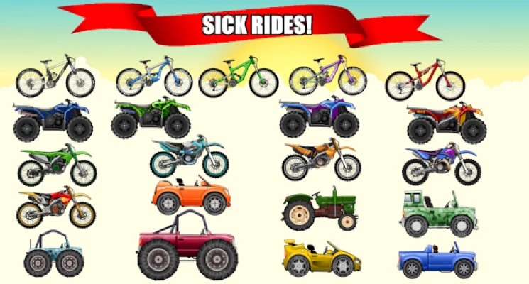 আপনার অ্যাডভেঞ্চারকে আরও ব্যক্তিগত এবং উত্তেজনাপূর্ণ করতে, ৪টিরও বেশি অনন্য চরিত্র থেকে আপনার পছন্দসই একটি বেছে নিন। আপনার যাত্রাপথের জন্য অপেক্ষা করছে ৯টিরও বেশি আসক্তিপূর্ণ বিশ্ব – রৌদ্রোজ্জ্বল সৈকত থেকে শুরু করে শান্ত গ্রাম্য পরিবেশ অথবা ধু ধু মরুভূমি, প্রতিটি স্থানই নিজস্ব চ্যালেঞ্জ নিয়ে হাজির হবে। ২১টিরও বেশি অসাধারণ বাইসাইকেল, BMX, মোটরবাইক এবং অন্যান্য যান থেকে আপনার পছন্দেরটি নির্বাচন করুন। এর মধ্যে রয়েছে শক্তিশালী মাউন্টেন বাইক, মজাদার BMX, কোয়াড বাইক, মোটোকross, জীপ, রেস কার, মনস্টার ট্রাক এবং ট্র্যাক্টর। প্রতিটি যানের ইঞ্জিন, সাসপেনশন এবং টায়ার আপগ্রেড করে সেগুলিকে আরও অপ্রতিরোধ্য করে তুলুন। এই অবিরাম রান মোডে আপনার সীমাহীন দক্ষতা দেখান।