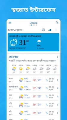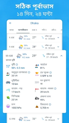 প্রকৃতির সাথে তাল মিলিয়ে চলতে আমরা আপনাকে সাহায্য করি। সূর্যোদয়, সূর্যাস্ত, দিনের আলোর সময়কাল এবং চাঁদের বর্তমান অবস্থা সম্পর্কিত জ্যোতির্বিজ্ঞান বিষয়ক তথ্য আপনার হাঁটা, সাইকেল চালানো বা মাছ ধরার পরিকল্পনাকে আরও সহজ করে তোলে। সব বয়সের ব্যবহারকারীদের জন্য ডিজাইন করা আমাদের ইন্টারফেসটি অত্যন্ত সহজবোধ্য এবং আপনার প্রতিটি ডিভাইসে নির্বিঘ্নে কাজ করে। আপনি একজন আবহাওয়া অনুরাগী হন বা কেবল দ্রুত তথ্য চান, আমাদের কাস্টমাইজযোগ্য ডিজাইন, পছন্দের থিম এবং পরিমাপের একক বেছে নেওয়ার সুযোগ আপনার অভিজ্ঞতাকে ব্যক্তিগত করে তোলে। হোম স্ক্রিনে উইজেট যোগ করে অ্যাপ না খুলেই তাৎক্ষণিক আবহাওয়ার ঝলক দেখুন। এমনকি আপনার Wear OS ডিভাইসেও এটি সংযুক্ত করে বৃষ্টির সম্ভাবনা পরীক্ষা করতে পারেন, আবহাওয়ার তথ্য আপনার কব্জিবন্ধেই।