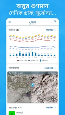 আমরা আপনাকে শুধুমাত্র তাপমাত্রা দেখাই না, বরং প্রকৃতিকে উপলব্ধি করার সুযোগ করে দিই। আমাদের উন্নত রেইন রাডার আপনাকে বৃষ্টির প্রতিটি ফোঁটা ট্র্যাক করতে সহায়তা করে। বিস্তারিত আবহাওয়ার মানচিত্র তাপমাত্রা, বৃষ্টি, তুষারপাত এবং বায়ুমণ্ডলীয় চাপের মতো গুরুত্বপূর্ণ স্তরগুলি তুলে ধরে, যেখানে সচল কণার অ্যানিমেশন বাতাস ও ঢেউয়ের গতিপথ বুঝতে সাহায্য করে। বিগত ১২ ঘণ্টার উপগ্রহ চিত্রগুলিও আপনার হাতের মুঠোয় থাকে। এছাড়া, বাতাসের গুণগত মান, আর্দ্রতা এবং অন্যান্য গুরুত্বপূর্ণ পরিবেশগত তথ্য, যা আপনার অ্যালার্জিকে প্রভাবিত করতে পারে, সে সম্পর্কেও বিস্তারিত প্রতিবেদন আমরা পরিবেশন করি। এটি আপনার বাইরের কার্যক্রম সুষ্ঠুভাবে পরিকল্পনা করতে এবং স্বাস্থ্য সুরক্ষায় এক গুরুত্বপূর্ণ ভূমিকা পালন করে।