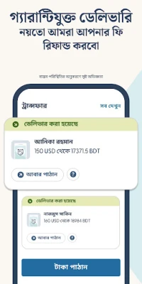 Remitly-এর মাধ্যমে আপনি আপনার পাঠানো টাকার গ্যারান্টিযুক্ত ডেলিভারি সময় এবং রিয়েল-টাইমে ট্রান্সফার সংক্রান্ত সর্বশেষ আপডেট জানতে পারবেন। এর ফলে, আপনার অর্থ কখন আপনার প্রাপকের হাতে পৌঁছাবে, তা নিয়ে আপনাকে দুশ্চিন্তা করতে হবে না। যদি কোনো কারণে নির্ধারিত সময়ের মধ্যে ট্রান্সফার সম্পন্ন না হয়, আমরা আপনার সার্ভিস ফি সম্পূর্ণ ফেরত দেব। বাংলাদেশ, ভারত সহ ১৭০টিরও বেশি দেশে বিস্তৃত আমাদের বিশাল নেটওয়ার্কের মাধ্যমে আপনি bKash, Upay, MTN, Vodafone এর মতো মোবাইল মানি সেবাদাতা এবং Dutch Bangla Bank, Islami Bank Bangladesh, Sonali Bank এর মতো বিশ্বস্ত ব্যাংকগুলোতে সরাসরি টাকা পাঠাতে পারেন।
