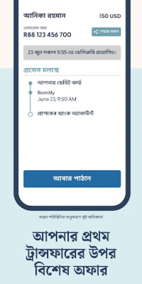 Remitly আপনার আর্থিক লেনদেনকে আরও সুবিধাজনক করে তোলে। ব্যাংক অ্যাকাউন্ট, ক্রেডিট কার্ড বা ডেবিট কার্ড ব্যবহার করে সহজেই অর্থপ্রেরণ করুন। কোনো লুকানো খরচ নেই, শুধু চমৎকার রেট এবং প্রথম লেনদেনে বিশেষ অফার উপভোগ করুন, যা আপনার প্রিয়জনদের কাছে আরও বেশি আর্থিক সহায়তা পৌঁছে দিতে সাহায্য করে। যেকোনো প্রয়োজনে, আমাদের ২৪/৭ সহায়তা দল আপনার পাশে আছে। ১৮টি ভাষায় উপলব্ধ সহায়তা কেন্দ্রের মাধ্যমে অথবা সরাসরি আমাদের সাথে যোগাযোগ করে আপনি দ্রুত সমাধান পেতে পারেন। Remitly Global Inc. আপনার বিশ্বস্ত আর্থিক অংশীদার।